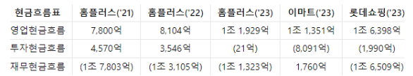 홈플러스의 재무제표 상태를 확인해 보면 부채가 상당한 것으로 볼 수 있습니다. 부채 비율을 확인해 본다면 21년 664%, 22년 944%, 23년 3,211% 로 증가되고 있으며 매년 부채가 자식을 잠식되는 모습을 보이고 있습니다. 결국 다른 유통업체인 이마트나 롯데쇼핑과 비교한다면 부채비율이 너무 높다는 것을 확인 할 수 있습니다. 손익계산서을 확인해 본다면 매출은 증가하지만 이익 및 손실이 점차 증가하는 것을 볼수 있습니다. 하지만 경쟁업체인 이마트나 롯데쇼필에 비교한다면 심각하다는 것을 확인할 수 있습니다.