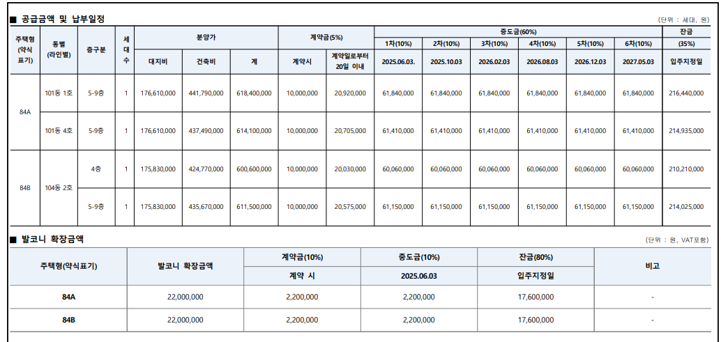 84 타입의 최저가격은 618,400,000원으로 계약 시 5% 10,000,000원을 납부 후에 20일 이내 20,920,000원 납부하며 중도금 60%는 6월 3일부터 4개 우러 간격으로 납부하며 입주 시 잔금 35% 216,440,000원을 납부하는 방식입니다.
