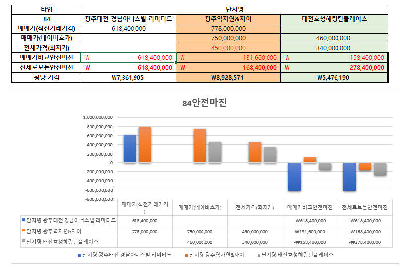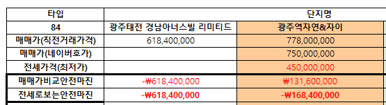 광주시에 대장단지는 역동에 위치한 광주역 자연&자이 단지에요. 네이버를 이용하여 최저 매매 가격을 확인해 보면 약 7억 5천만 원에 매물이 나왔으며 전세 가격은 약 4억 5천만 원에 매물이 나와있다는 것을 확인할 수 있어요. 그렇다면 안전마진은 약 1억 3천만 원이 발생해요.