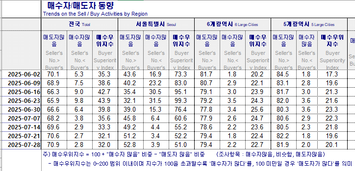 매수, 매도 동향을 확인해 보면 현재 매수자 우휘 시장이라는 것을 알 수 있습니다. 수도권,지방 따지지 않고 매수자 우위 시장이라는 것을 확인할 수 있어요.