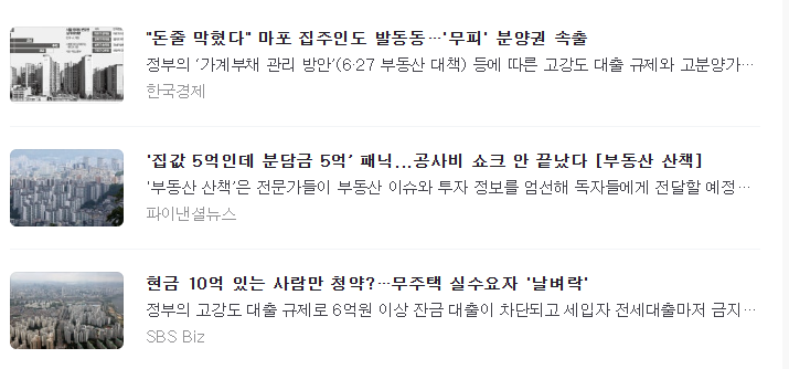 6.27 대책 이후 부동산 시장에 거래가 이루어지지 않는다는 뉴스와 그에 따른 6억 이하 대출규제까지 이루어지면서 빠르게 부동산 가격이 하락되는 모습을 보이고 있습니다.