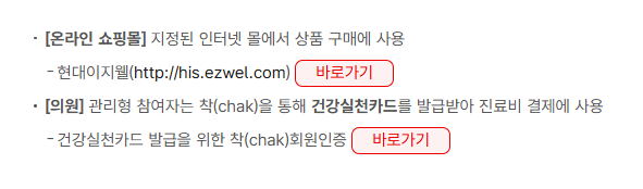 포인트는 지정된 온라인 인터넷몰에서 상품을 구매시 사용이 가능하며 관리형 참여자는 착(chak)을 통해 건강실천카드를 발급받아 질료비 결제에 사용이 가능합니다.