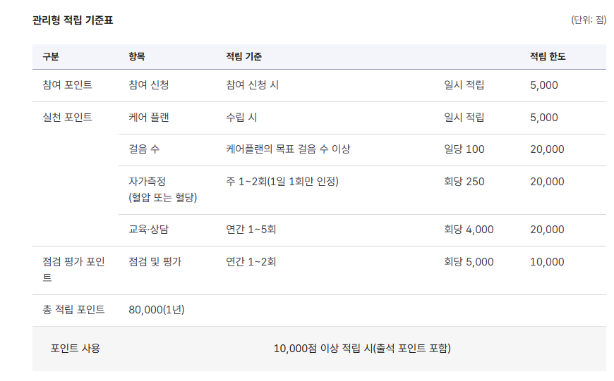 포인트는 예방형의 경우 2년동안 120,000원 적립이 가능하며 관리형 경우 1년 동안 80,000원 적립이 가능합니다.